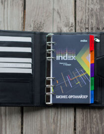 Органайзер снаружи закрывается на хлястик с магнитной кнопкой. Оригинальная форма хлястика добавляет изделию неповторимость. Внутри есть зажим на 6 колец диаметром 22 мм, в который вставляется блок.Слева кожаный карман, на нём 8 прорезных кармашков под кредитные карты и один кармашек с пластиковым окном. Справа 3 плоских кожаных кармана во всю высоту, на одном из них прорезной карман на молнии.
