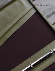 На лицевой стороне есть карман для документов,которые всегда желательно иметь под рукой,не теряя время на открывание папки. Внутри слева расположены два плоских кожаных кармана во всю высоту папки, на одном из них 10 прорезных кармашков под кредитки и один кармашек с сеткой. Справа горизонтальный карман под блокнот формата А4, а также вертикальный карман под планшет, который можно заказать отдельно и петля для ручки. На корешке вставлен зажим на 4 кольца диаметром 16 мм, на него удобно вставляются пластиковые файлы. Качественная молния позволяет быстро и мягко открывать-закрывать папку.